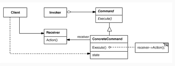 receiver를 담고 있는 커맨드를 invoker에게 탑재 => invoker가 커맨드를 실행시키면서 receiver에게 동작 수행