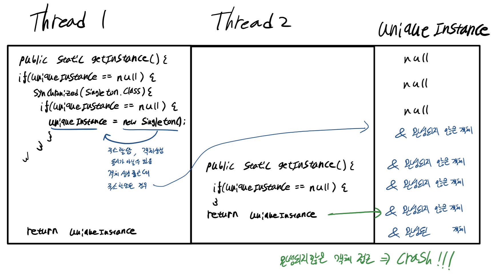 => 처음이 아니면 uniqueInstnace가 null일 수 없음, 멀티 쓰레드로 발생하는 문제 해결