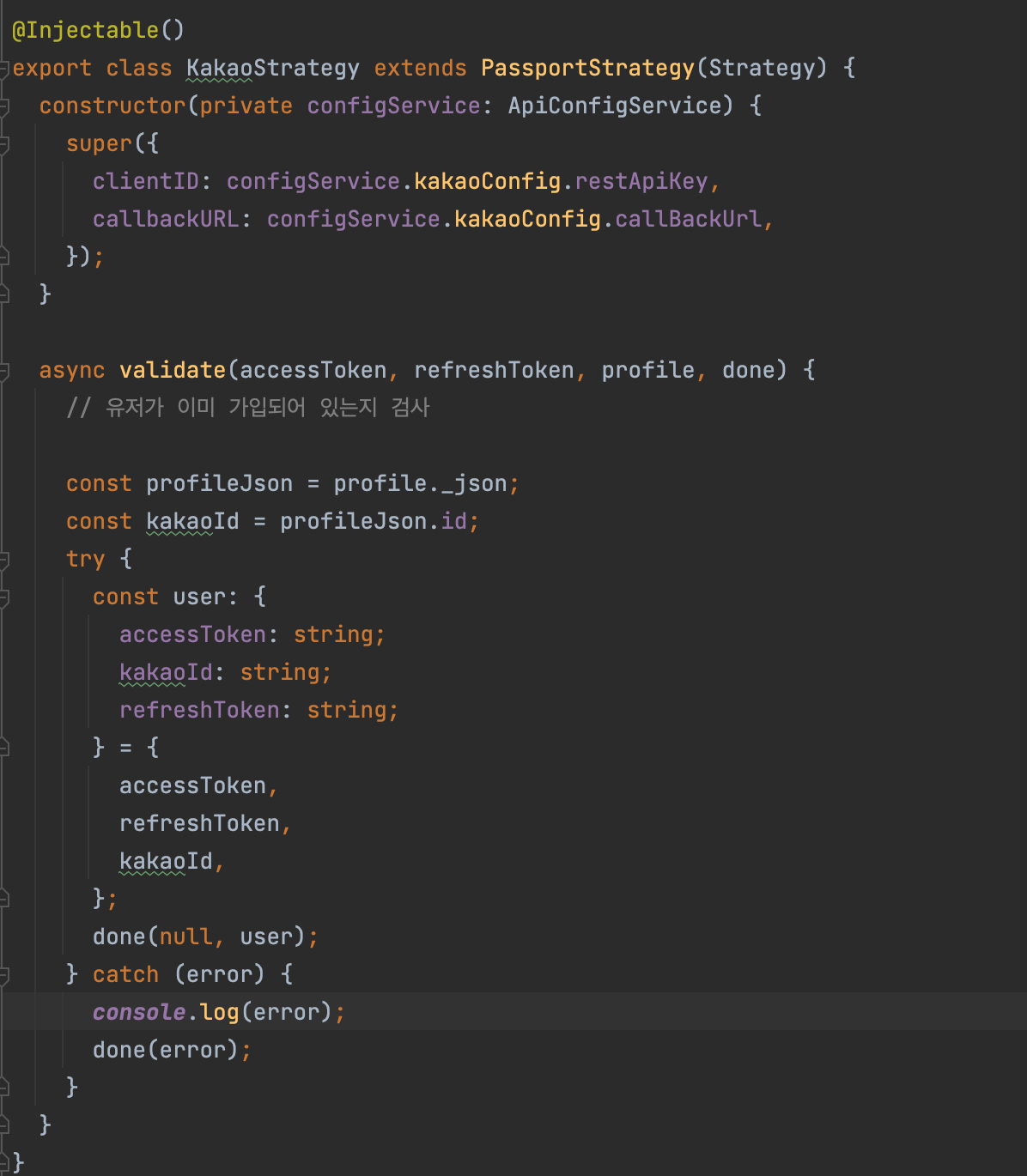위의 블로그의 글처럼 controller 로 login, redirect,... 그리고 몇 개의 라우터로 카카오 공식 문서가 알려주는 대로 api 콜을 날려서 토큰과 유저 정보를 받아오는데 나는 여기에 kakao Strategy 를 만들어 @UseGuard() 데코레이터로 유효성 검사 등등의 작업을 시켜주고 싶었다.