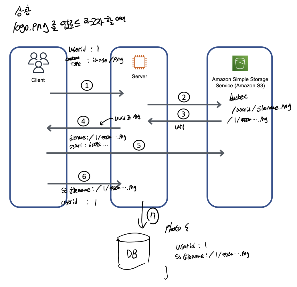 결국 내가 필요했던건 게시글에 올린 이미지 혹은 유저가 올린 이미지를 볼 수 있게 하는 것이였기에 그냥 s3에 저장되는 uuid로 만들어진 파일명만 클라에게 던졌다가 클라가 이를 다시 업로드완료 보고를 할때 s3의 파일명과 userId( 혹은 게시글 id)를 다시 던져주어 이것을 DB에 저장하기로 했다.